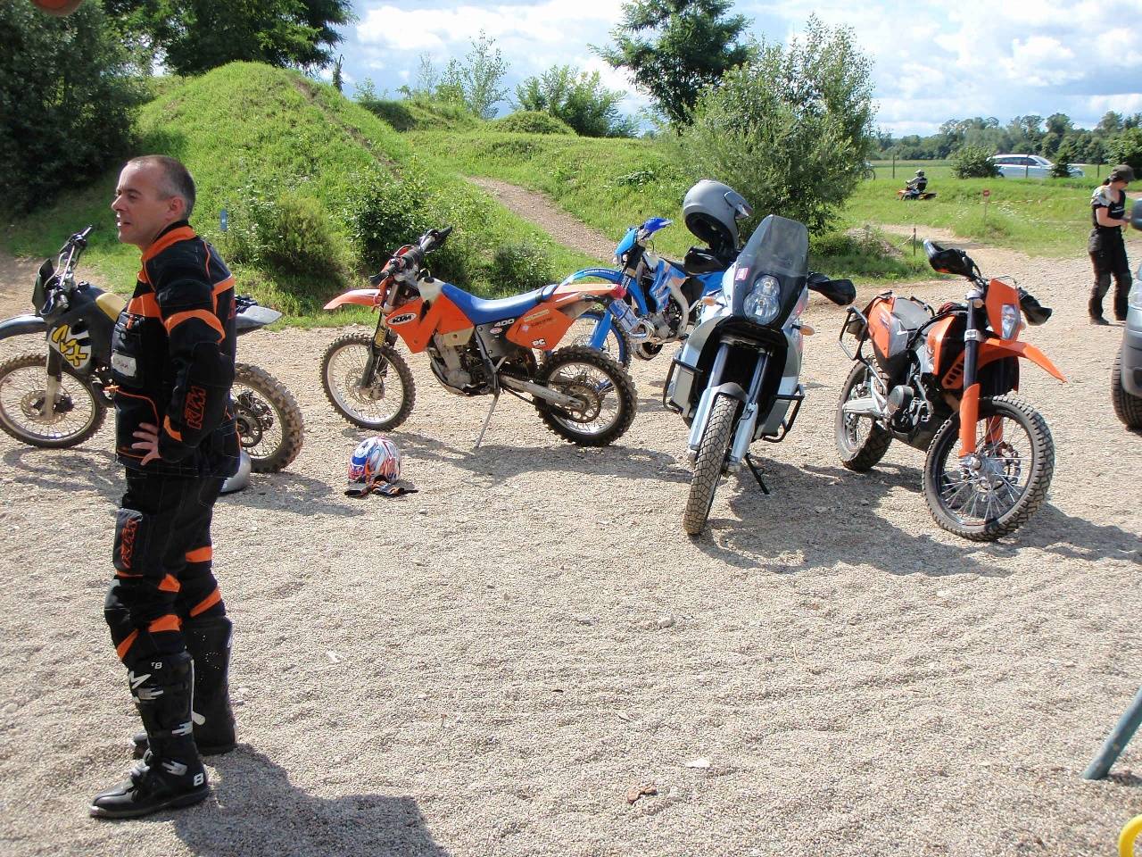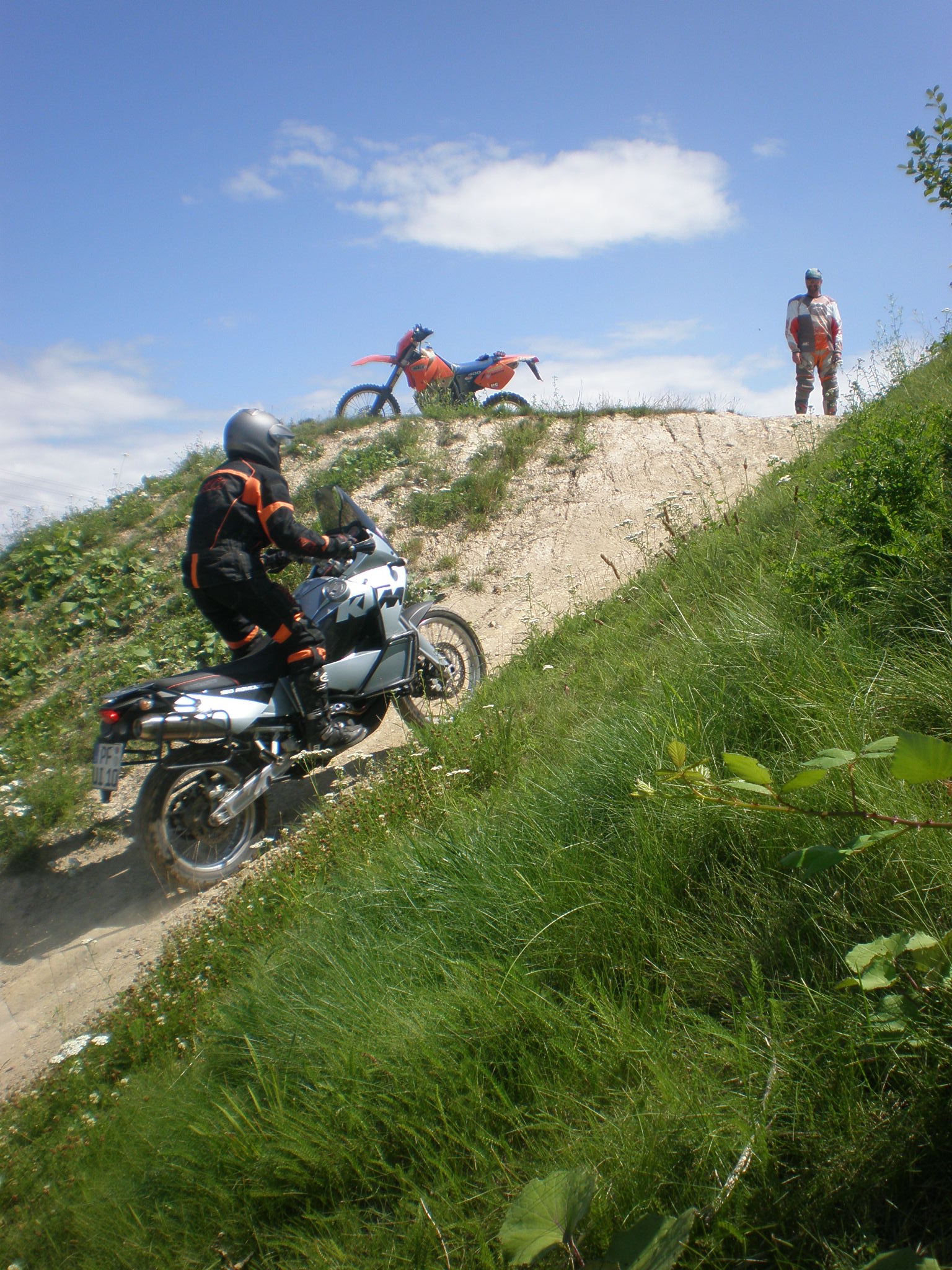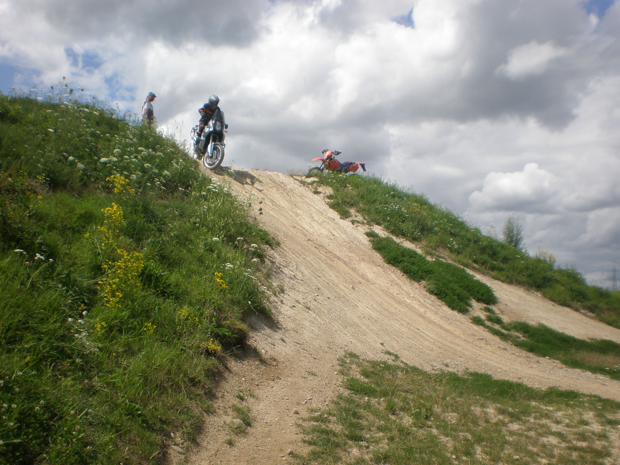 Kurzentschlossen die Anmeldung für ein Wochenende mit Anleitung fürs Fahren im Gelände. Meine Kiste ist neben den anderen die Größte und Schwerste und ich mit 172 cm und ca. 65 kg nicht grade der Herkules ;). Mit dabei eine KTM LC4 690, eine Honda Dominator, eine Sachs EX 125, eine BMW GX 450, sowie 2 KTM EXC 400 und eine TM 350 (Zweitakter) sowie zwei BMW 650 GS.