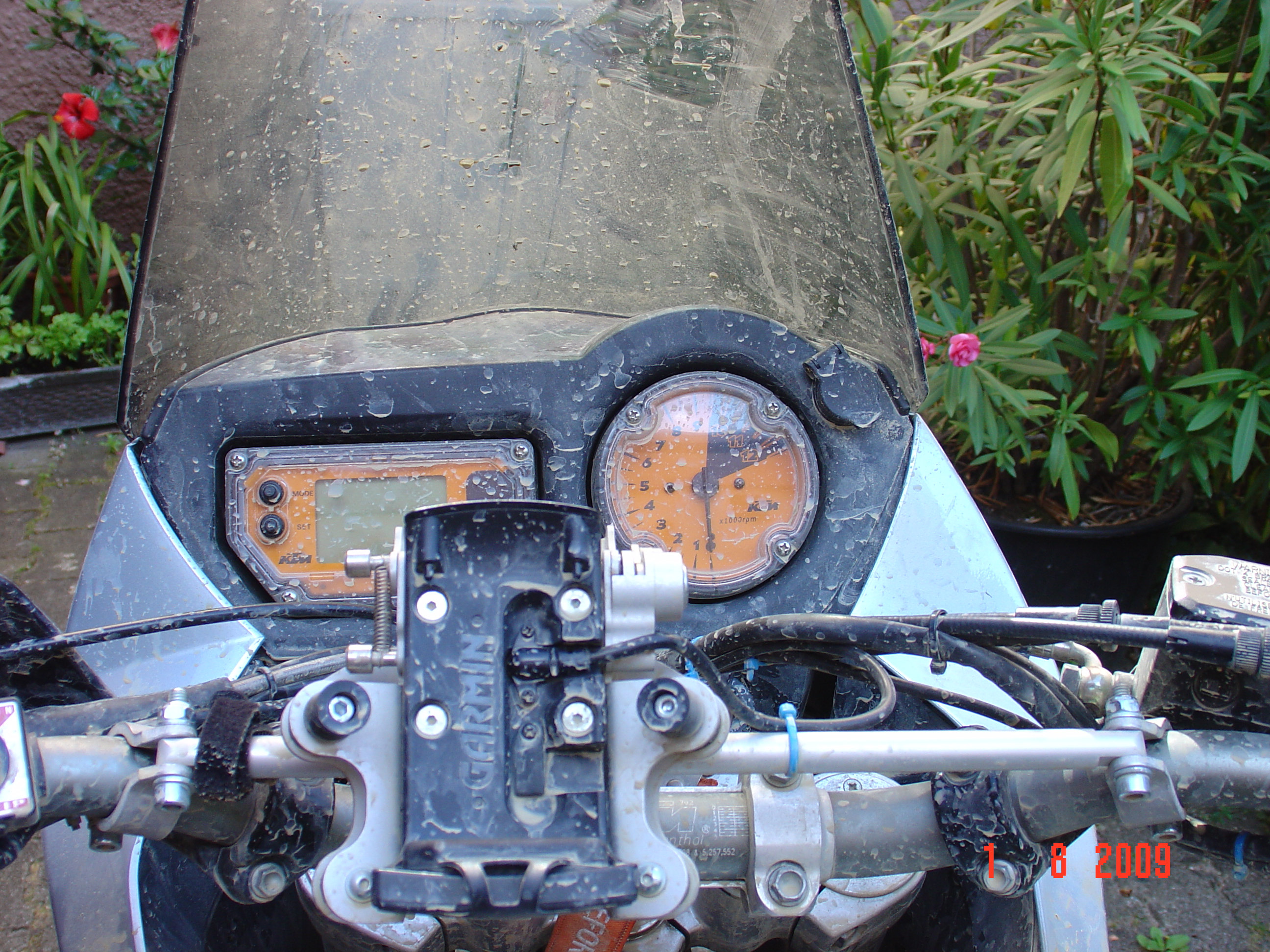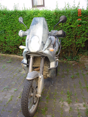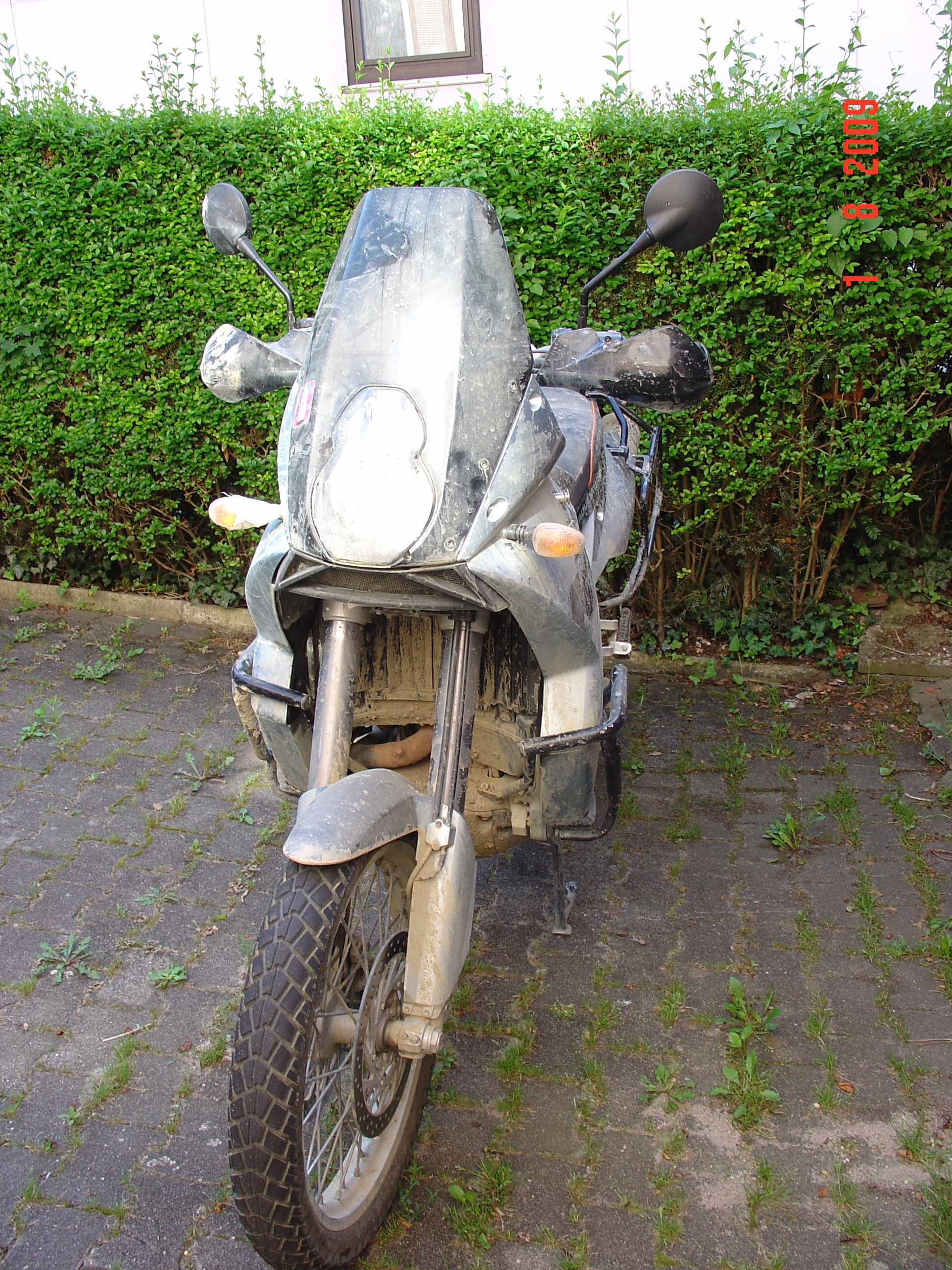 Meine Adventure ist schon vom Samstag leicht lädiert, der rechte Blinker hat sein Leben ausgehaucht, die Verkleidung vorne ist nach rechts und nach hinten verschoben. Ausserdem zieren einig Kratzer den bisher makellosen Lack. Die Sturzbügel haben aber das schlimmste verhindert, auch wenn diese jetzt auch verbogen sind und wohl nicht mehr oder nur schwer wieder zu montieren sind.